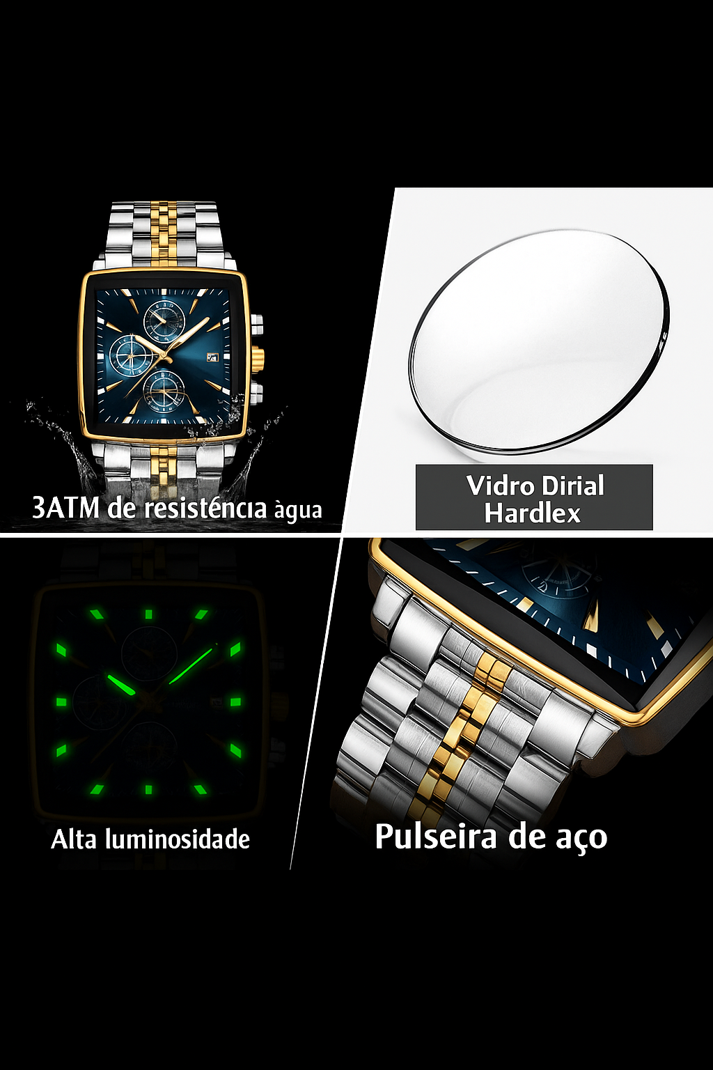 - Modelo: Cronógrafo Luxo Masculino – Caixa Quadrada Azul e Dourada